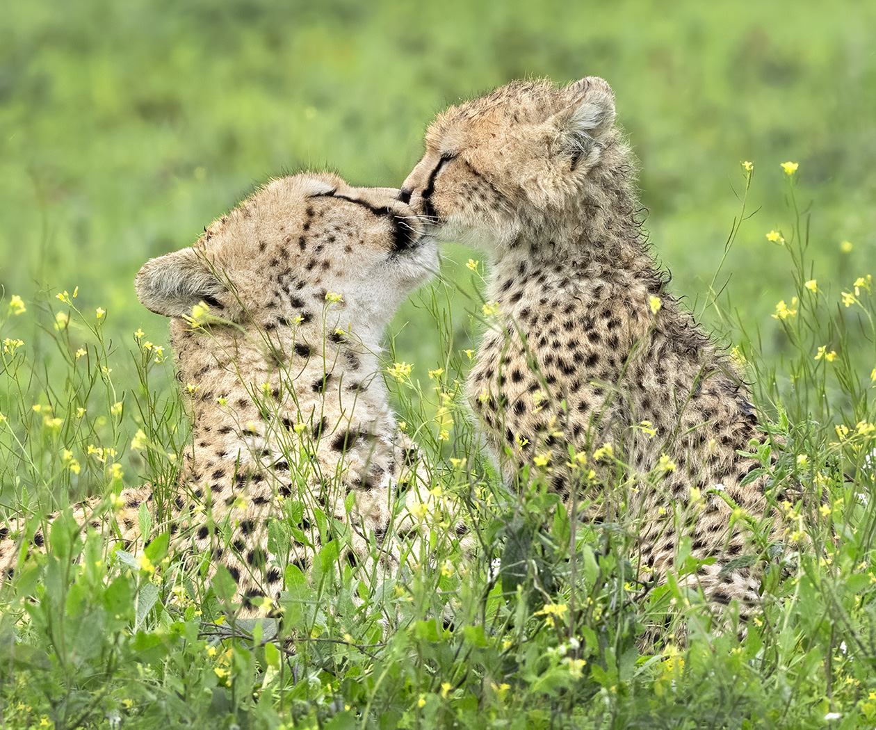 Mother and young cub nuzzle as they relax over a recent kill. A sweet and endearing moment.