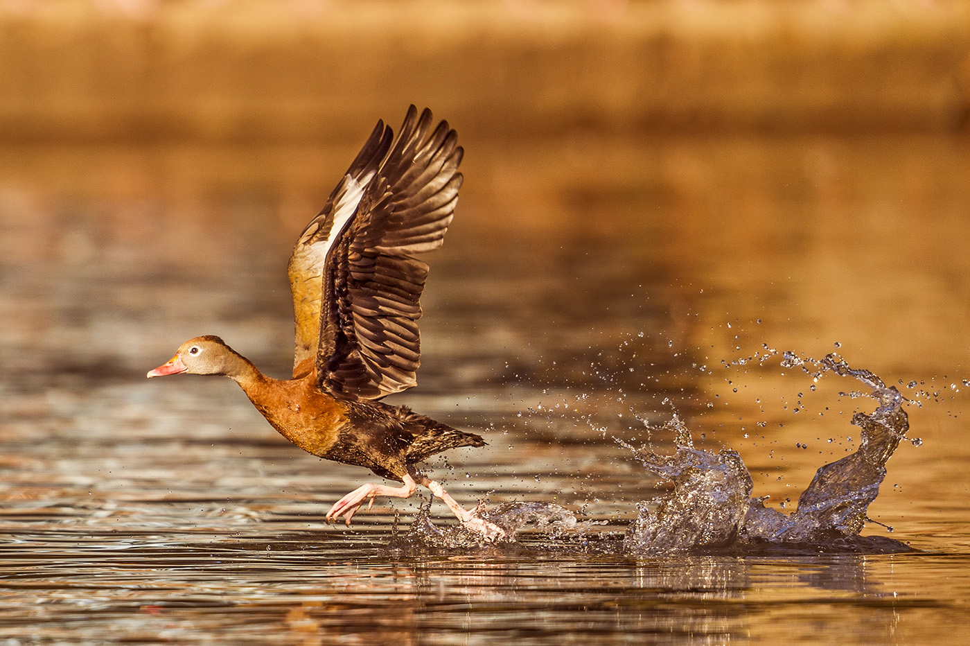 A black-bellied whistling duck runs across the water during take off at a park in New Orleans, Louisiana.
