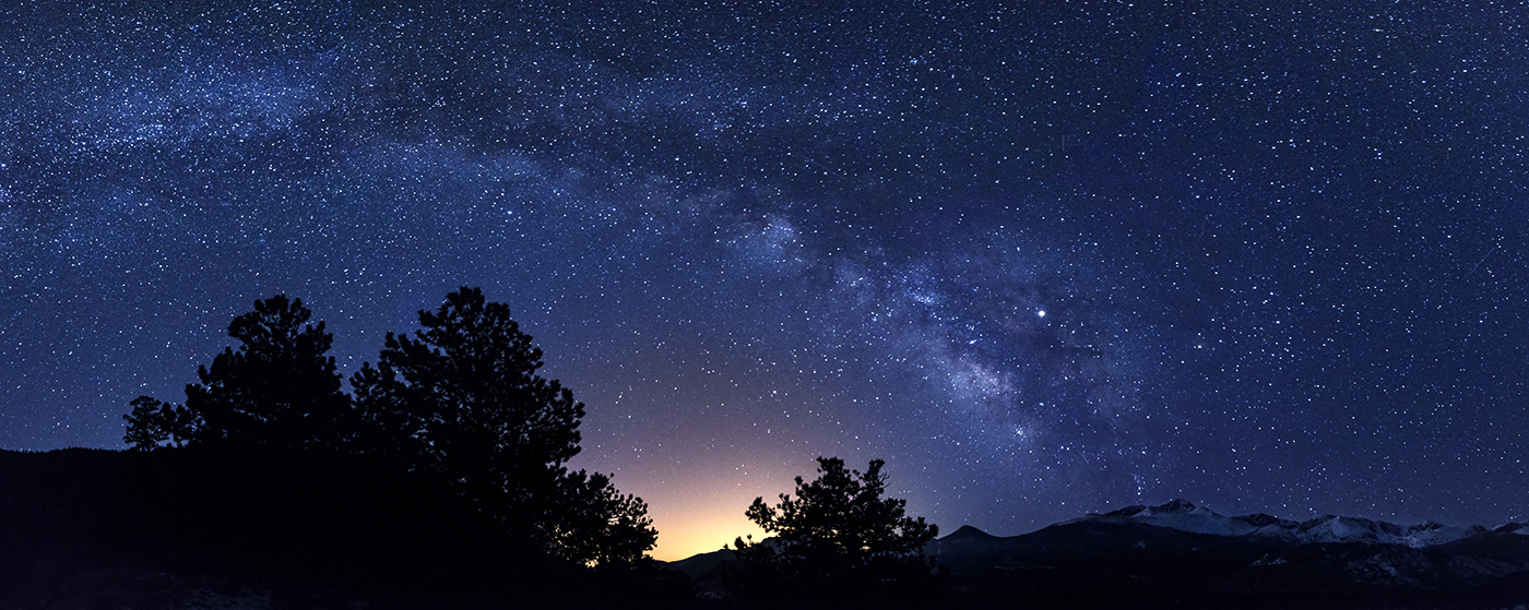 The Milky Way stretches over the lights of the Front Range and down into the snow-capped Longs Peak in Rocky Mountain National Park.