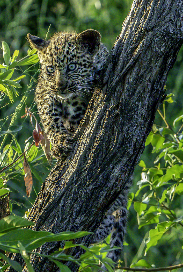 Mom called this baby leopard to come eat a kill (which is why there is blood on his nose), but then a hyena smelled the kill so she told him to go up a nearby tree while she took a defensive position.