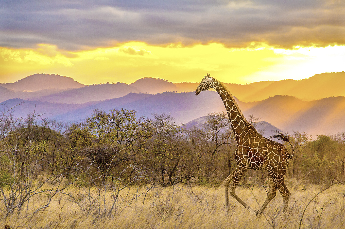 Caught on the fly as our vehicle was heading back to the lodge at the end of the day, and startled this giraffe.