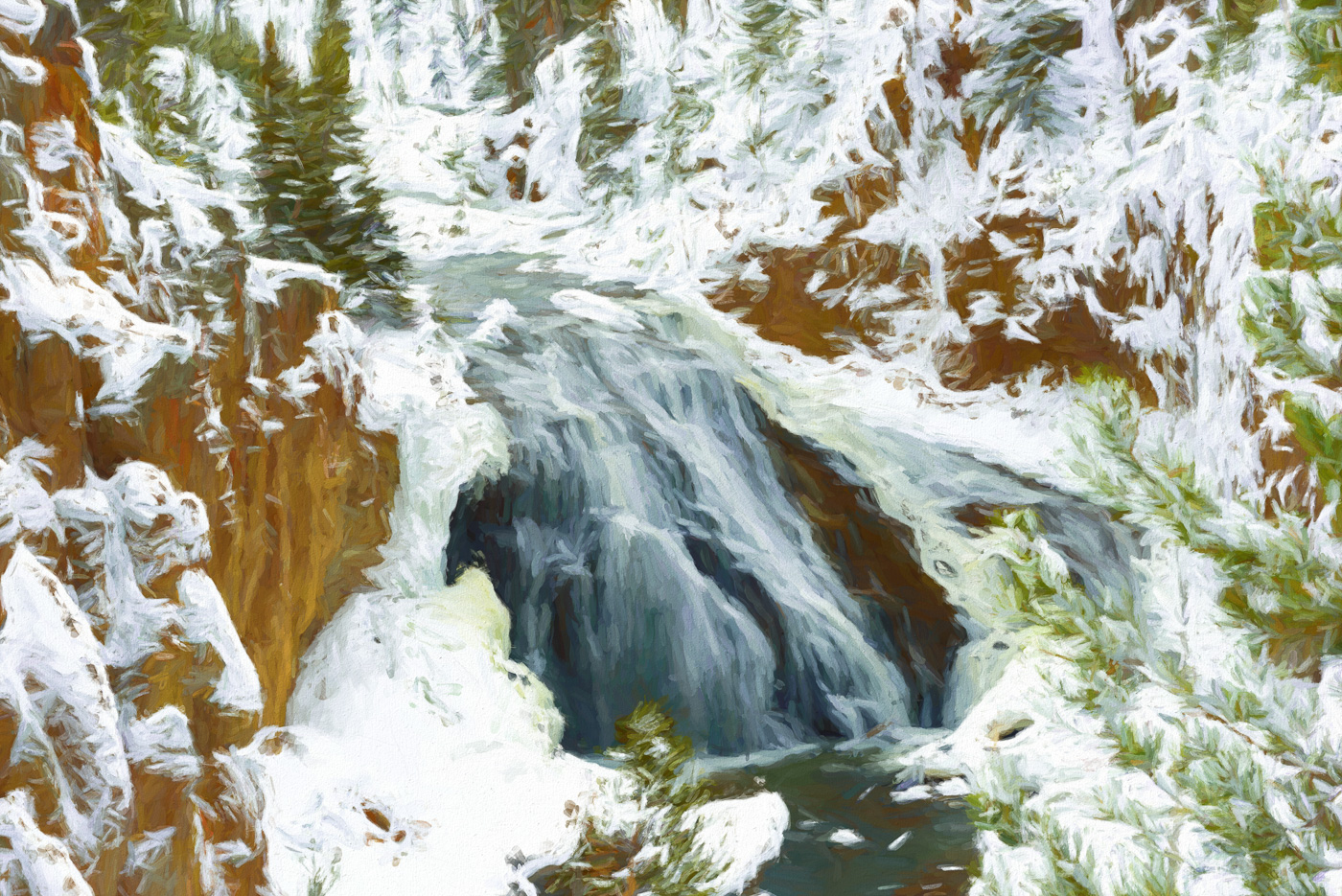 Winter in Yellowstone is an extraordinary time for photography, with the ice and snow lending themselves to interesting landscapes. At this time Gibbons Falls was still roaring, the water cutting a path through the ice and snow intent upon its journey. The colors of the blue water and evergreen trees juxtaposed against the white pristine snow and brown rock provided a beautiful contrast in a world of white.