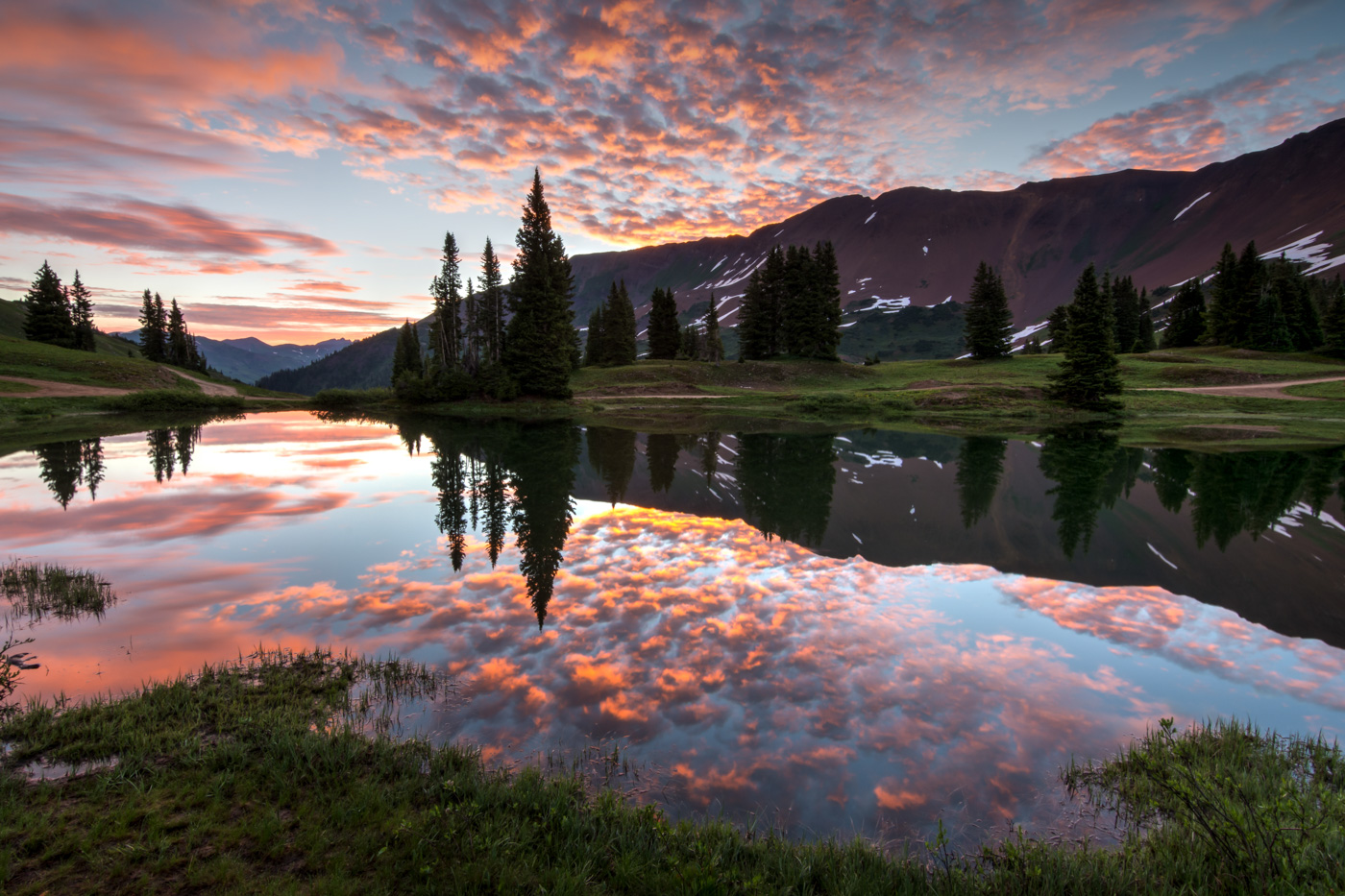 A perfect sunrise over the mountains, reflecting beautifully on the pond at Paradise Divide.