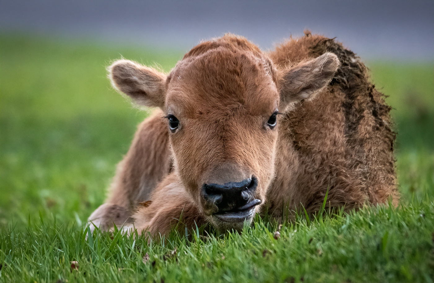 A bison cow had just dropped this newborn calf on the front lawn of the Mammoth Hot Springs Post Office. The meconium (first stool) is still visible on its rear end. This photo was taken with a long lens at ground level and cropped to accomplish the desired effect. The calf was not pressured.
