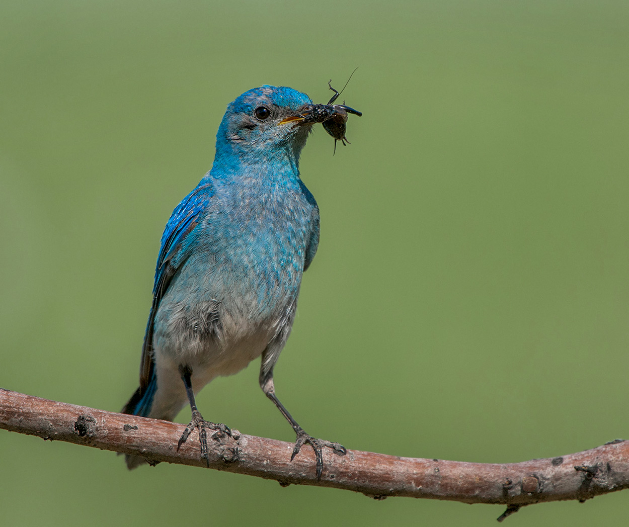 Bluebird with fresh beetle in its beak ready to feed its babies.