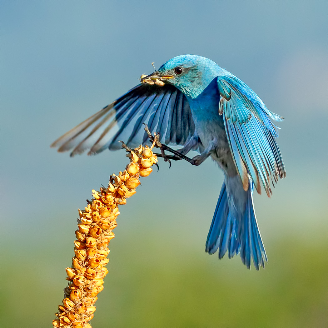 Male Mountain Bluebird with insect for chicks