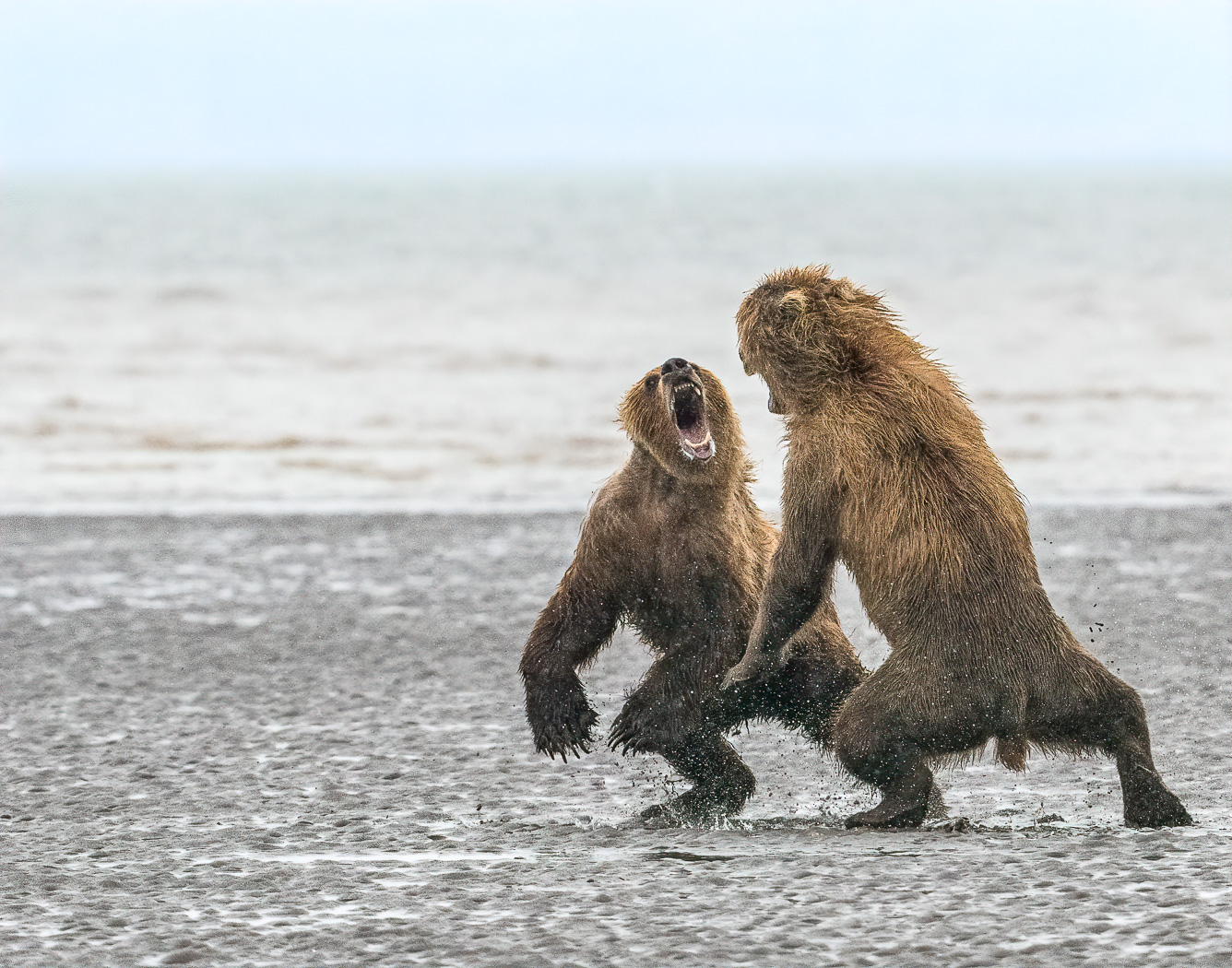 These are two sub-adult coastal brown bears I watched interact over several days. On this day, the younger bear would not stop antagonizing the older bear as he searched the mudflats for his dinner. After many warnings, he finally decided he had had enough and retaliated.