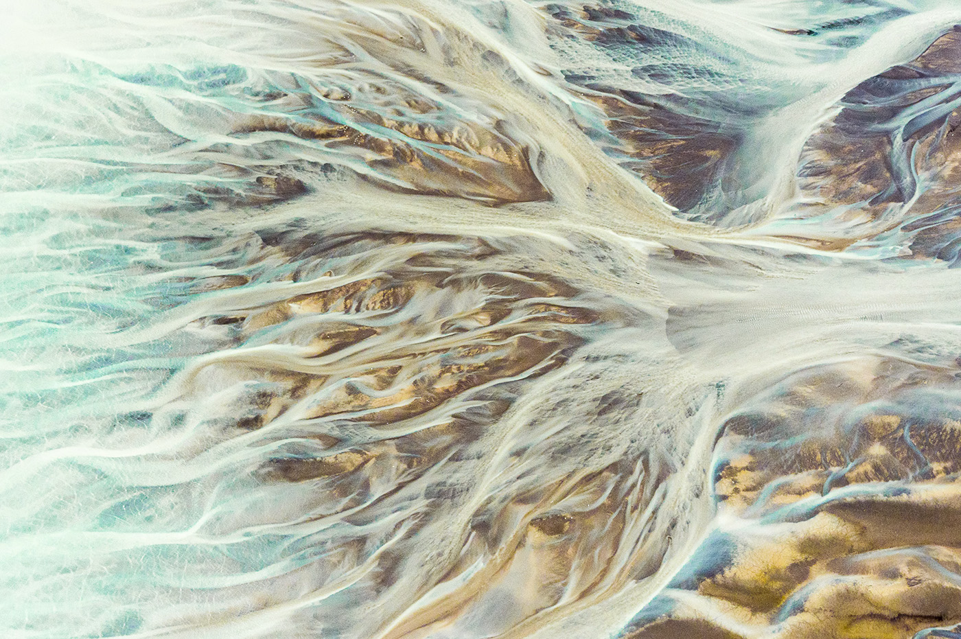 A braided river flows through sediment and sand into Cook Inlet, Alaska.