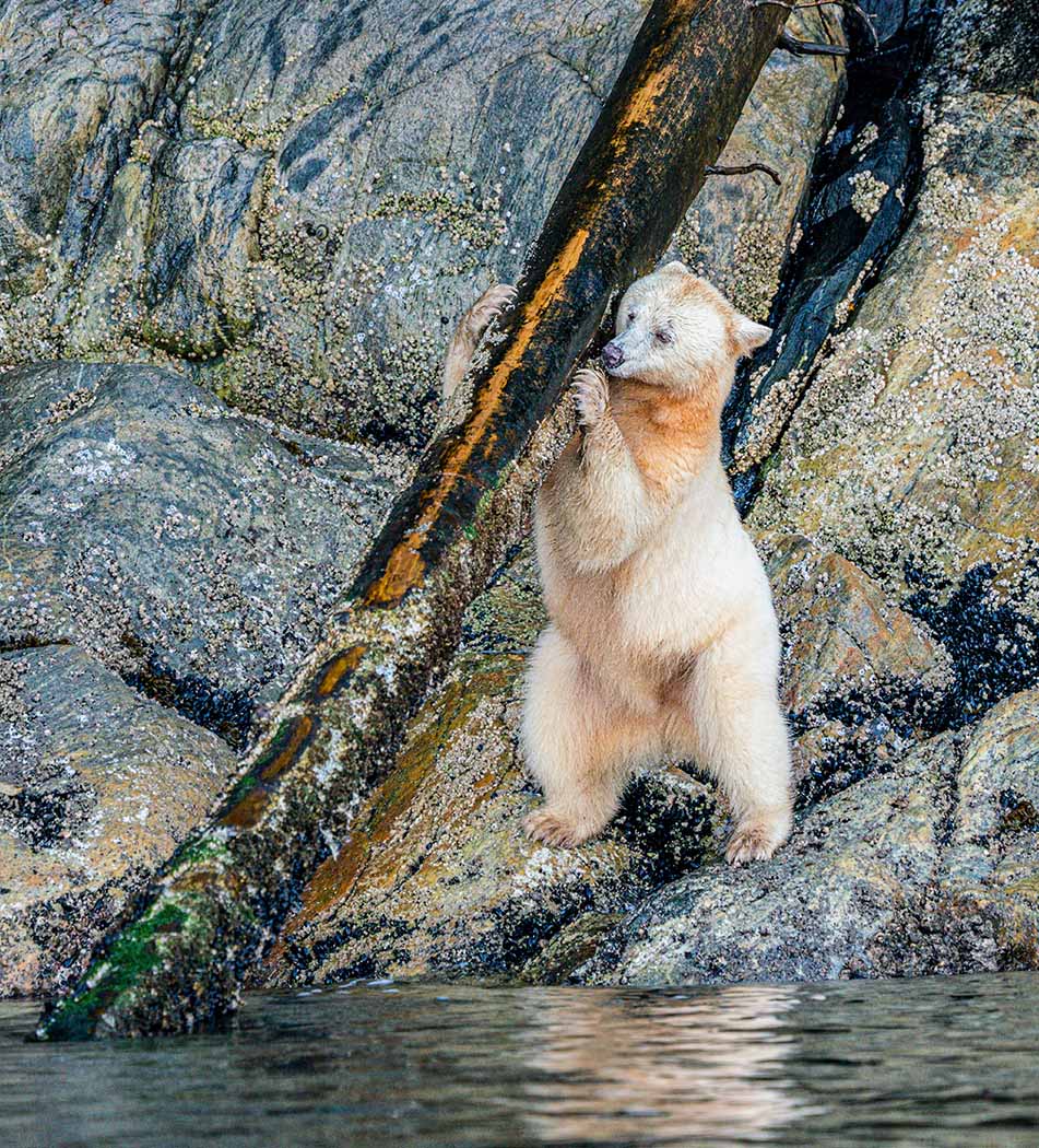 Spirit Bear Log Lifter - It almost appear that Spirit Bear Strawberry is lifting a log when really she is looking for tasty barnacles. Gribbell Island, Hartley Bay, Great Bear Rainforest, British Columbia, Canada.