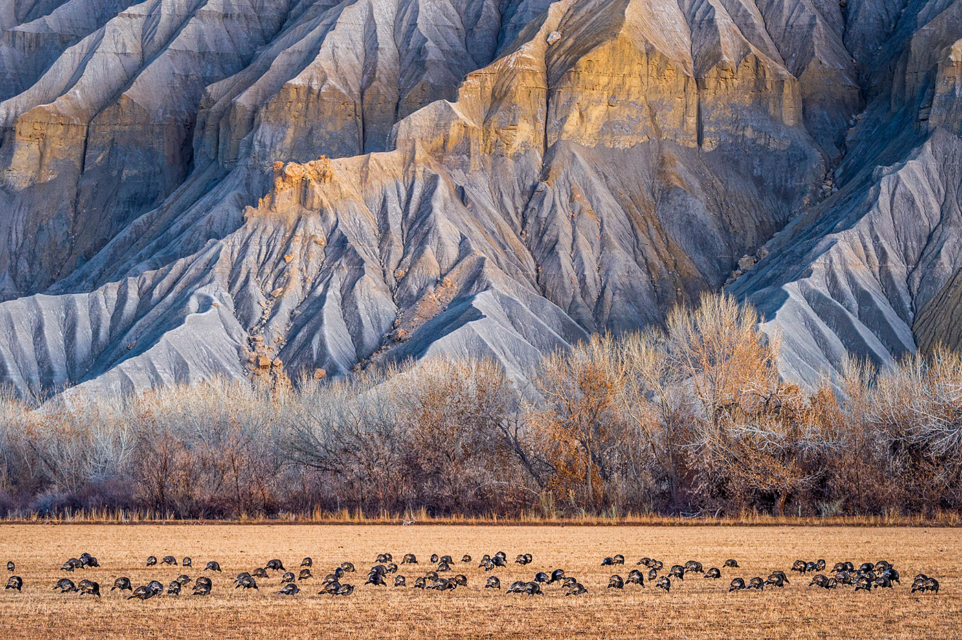 A flock of turkeys feed in a field below the badland cliffs near Capital Reef National Park, Utah.