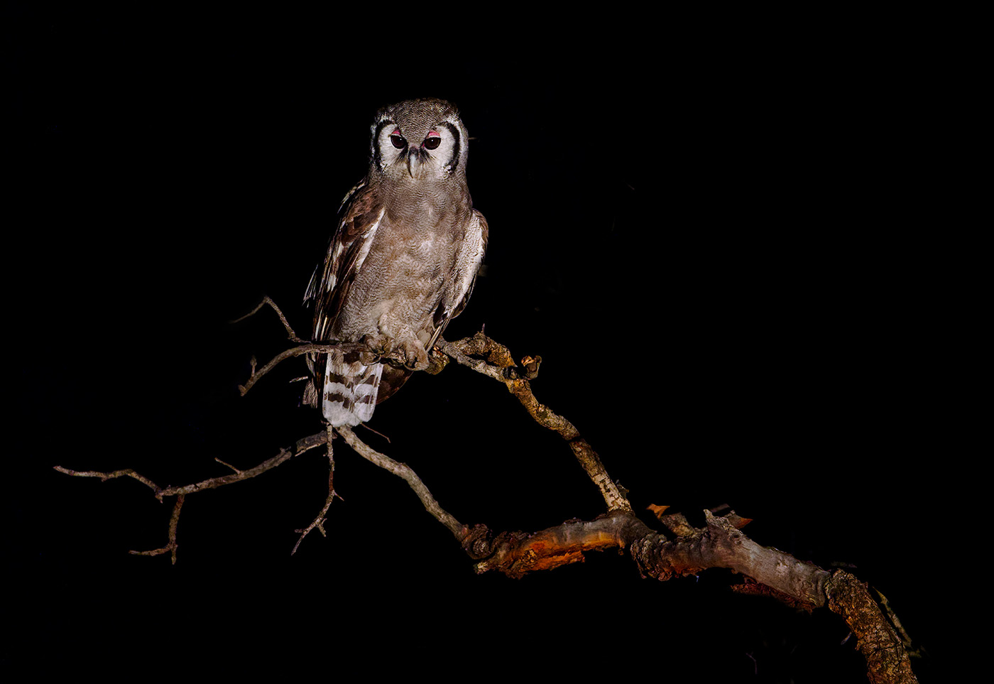 Spotlight from the safari vehicle illuminated this owl. Taken while on safari with Eagle Eye Safaris.
