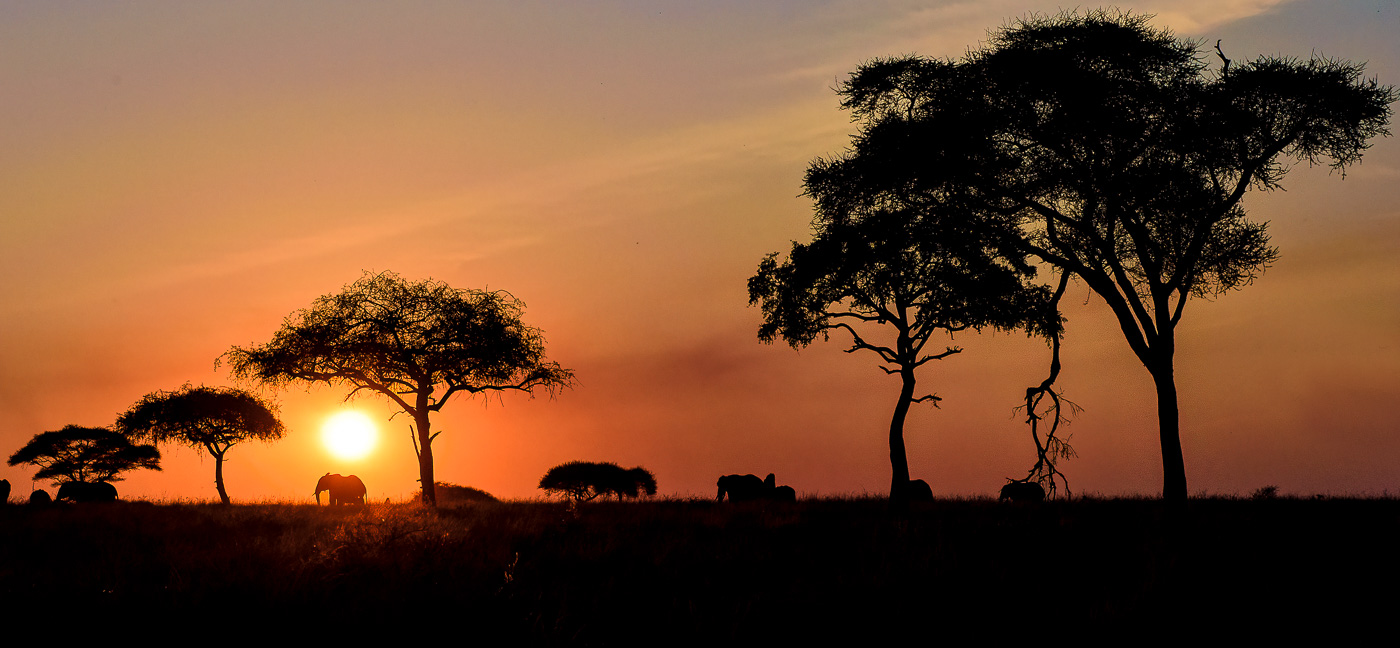 As the sun sets over Tarangire National Park, elephants travel to their evening grounds.