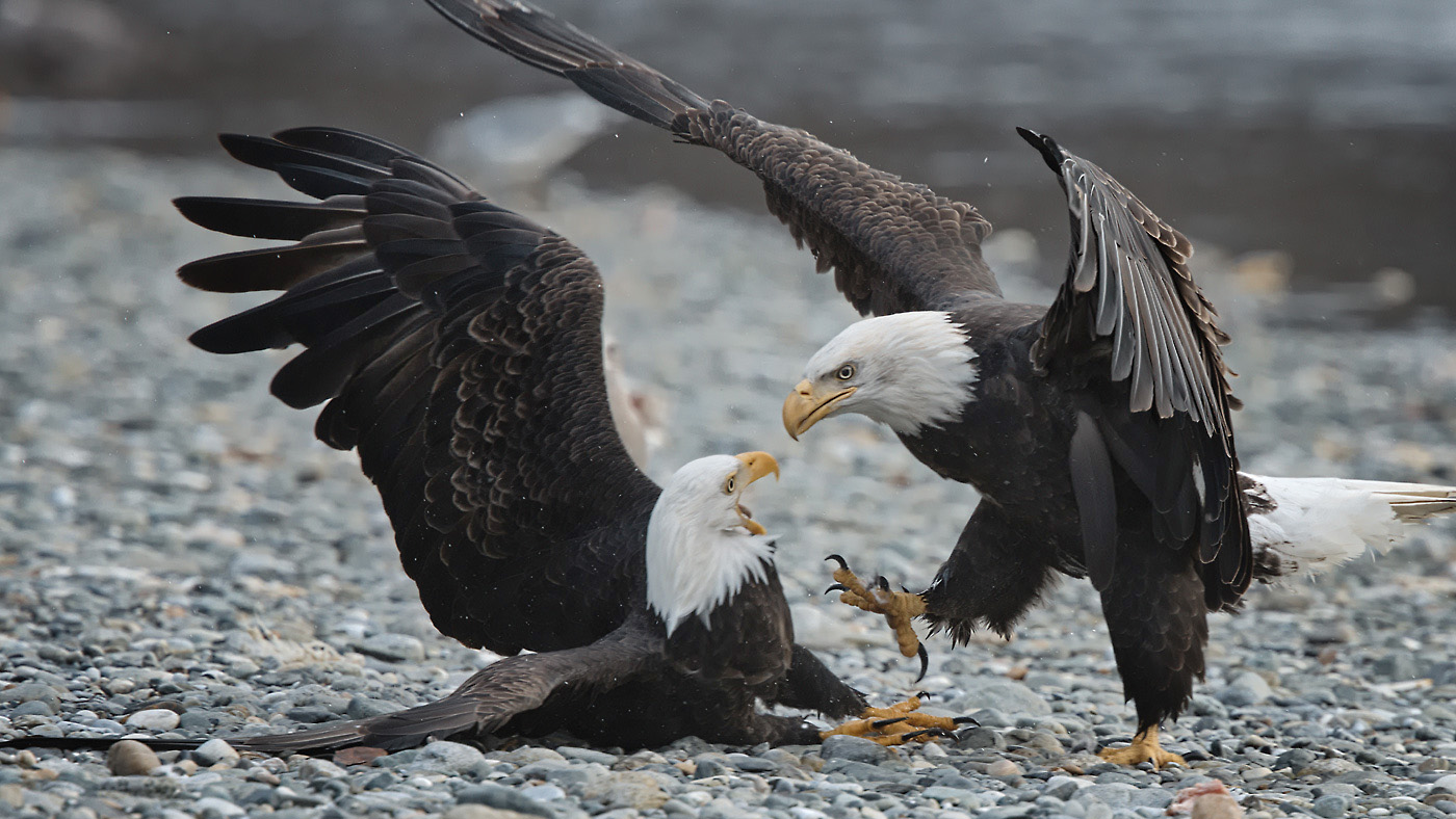 Two eagles fight over salmon. One is down and basically out as he is about to get stomped.