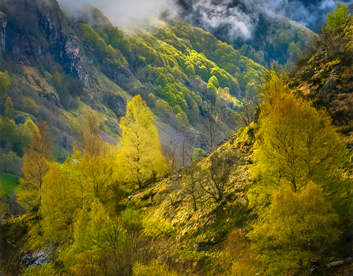 Morning light hits budding trees in the Pyrenees, following storm clearing off.