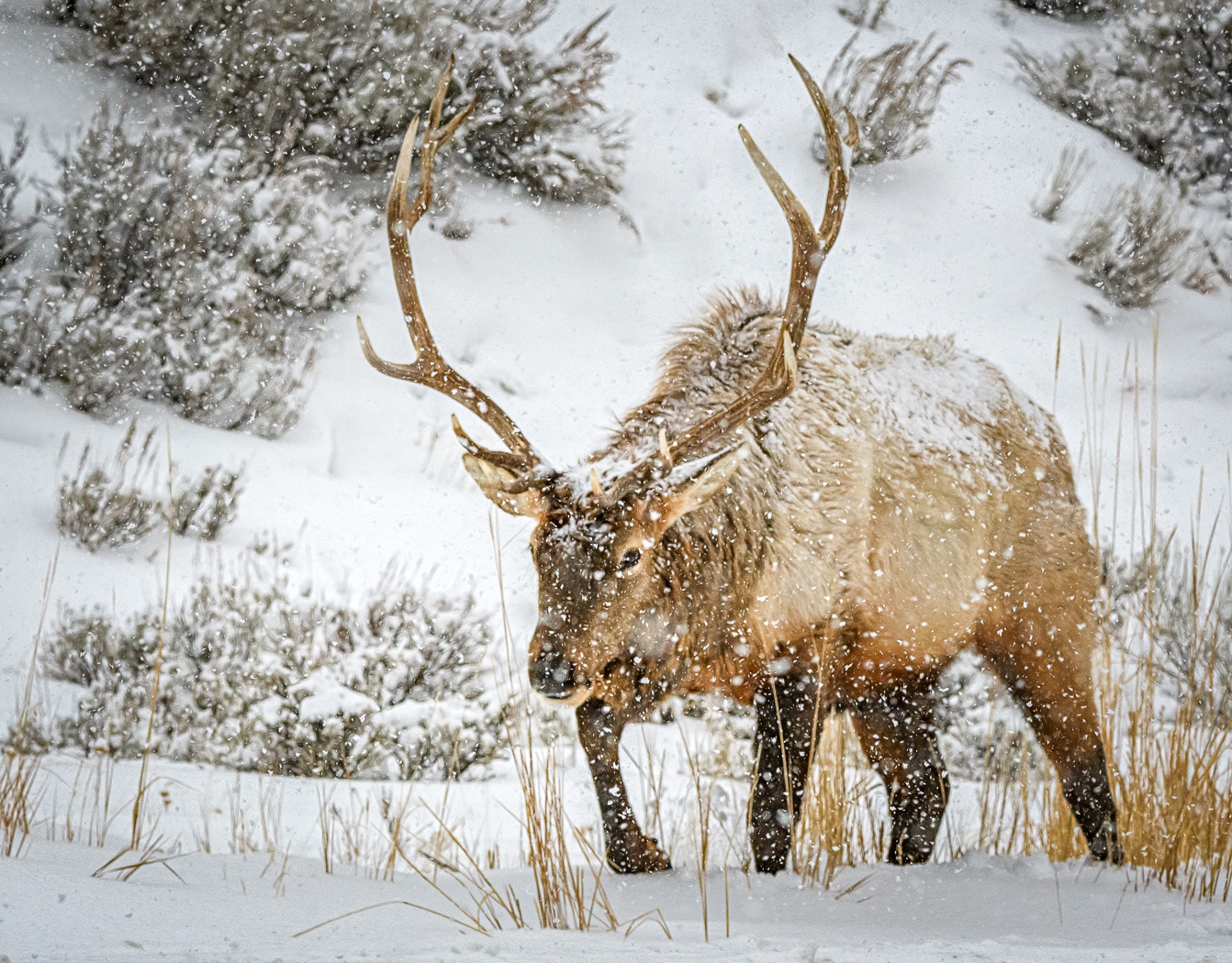 It was snowing pretty hard on my way through Mammoth Hot Springs when I came upon this bull elk looking for some grass to forage. He had no interest in anyone or anything around him as he pushed the snow away to graze. I watched him for about 10 minutes, thinking that I was lucky to have a warm cozy room waiting for me.