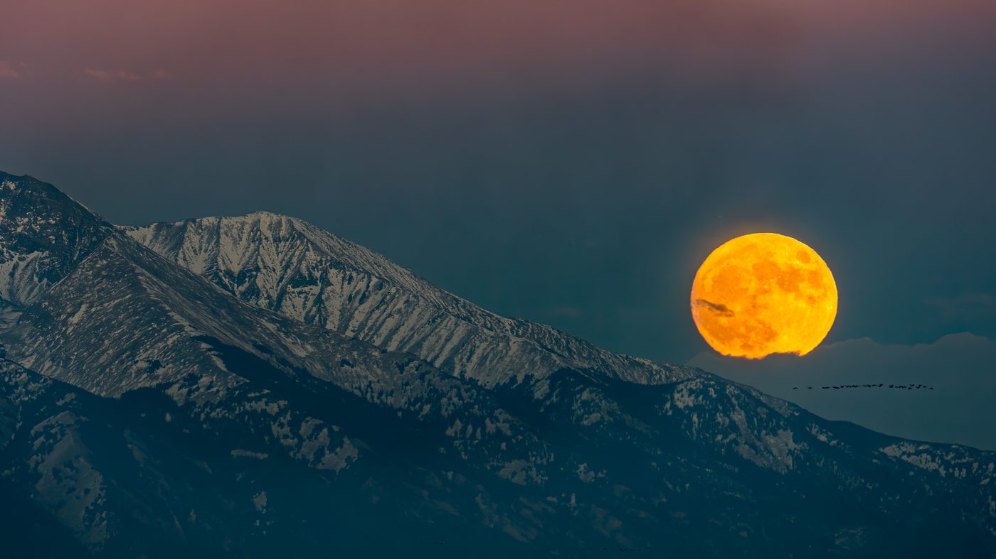 Waiting for the moon to rise over the mountain, I captured this image. Note the cranes in the lower right as well.
