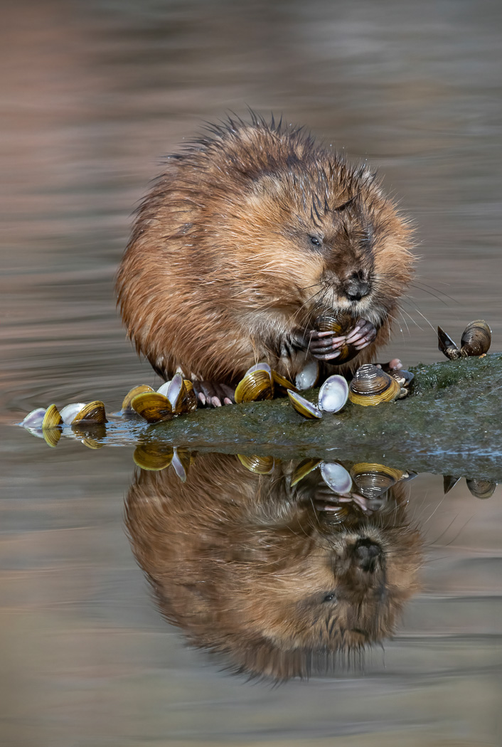 I Spotted this Muskrat diving for clams, setup in the bushes and it ended up surfacing on a rock and began to bring clams back to this spot, allowing me to photograph the feast.