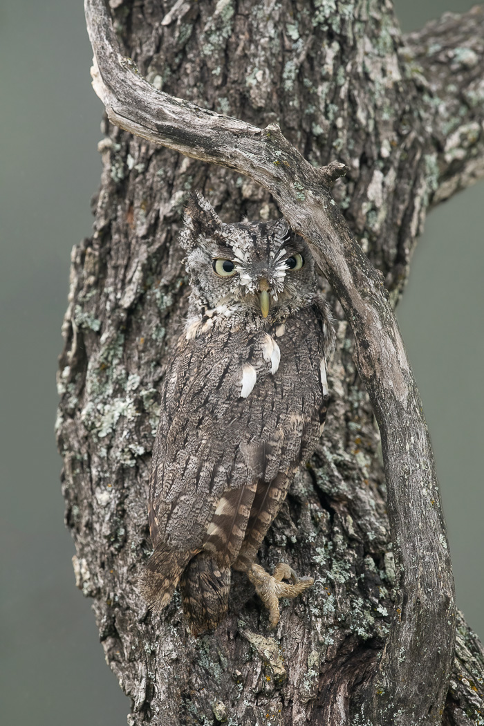 Eastern Screech Owl belonging to the Last Chance Forever Bird of Prey Conservancy, blending in with the tree bark.