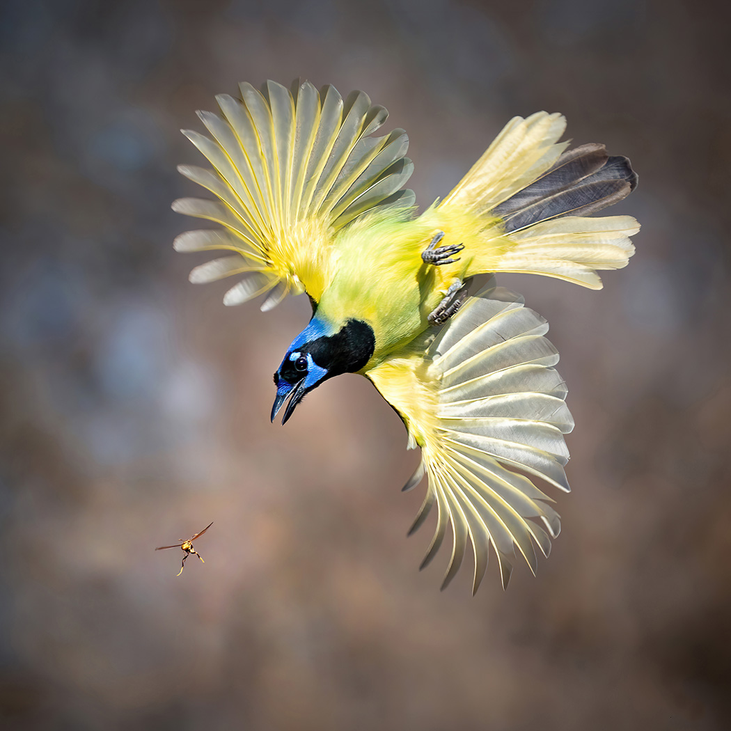 Green Jay chasing wasp