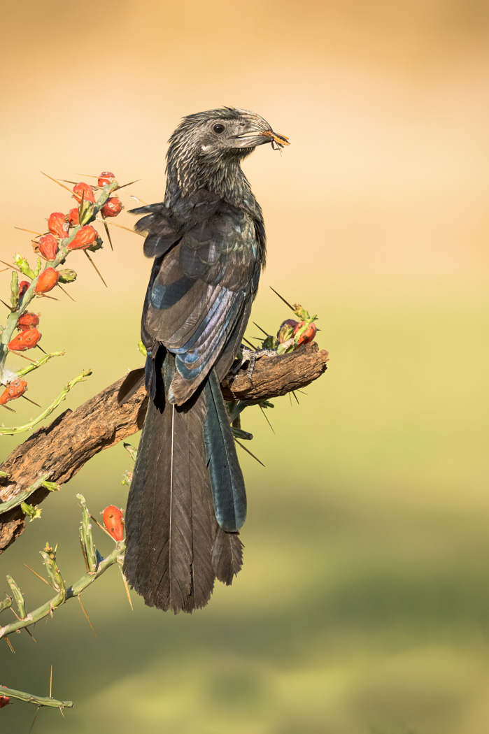 The image was taken when this Ani was searching for a mate. He landed and picked up the insect and flew all around trying to present it. Unlucky for him, he did not have any takers.