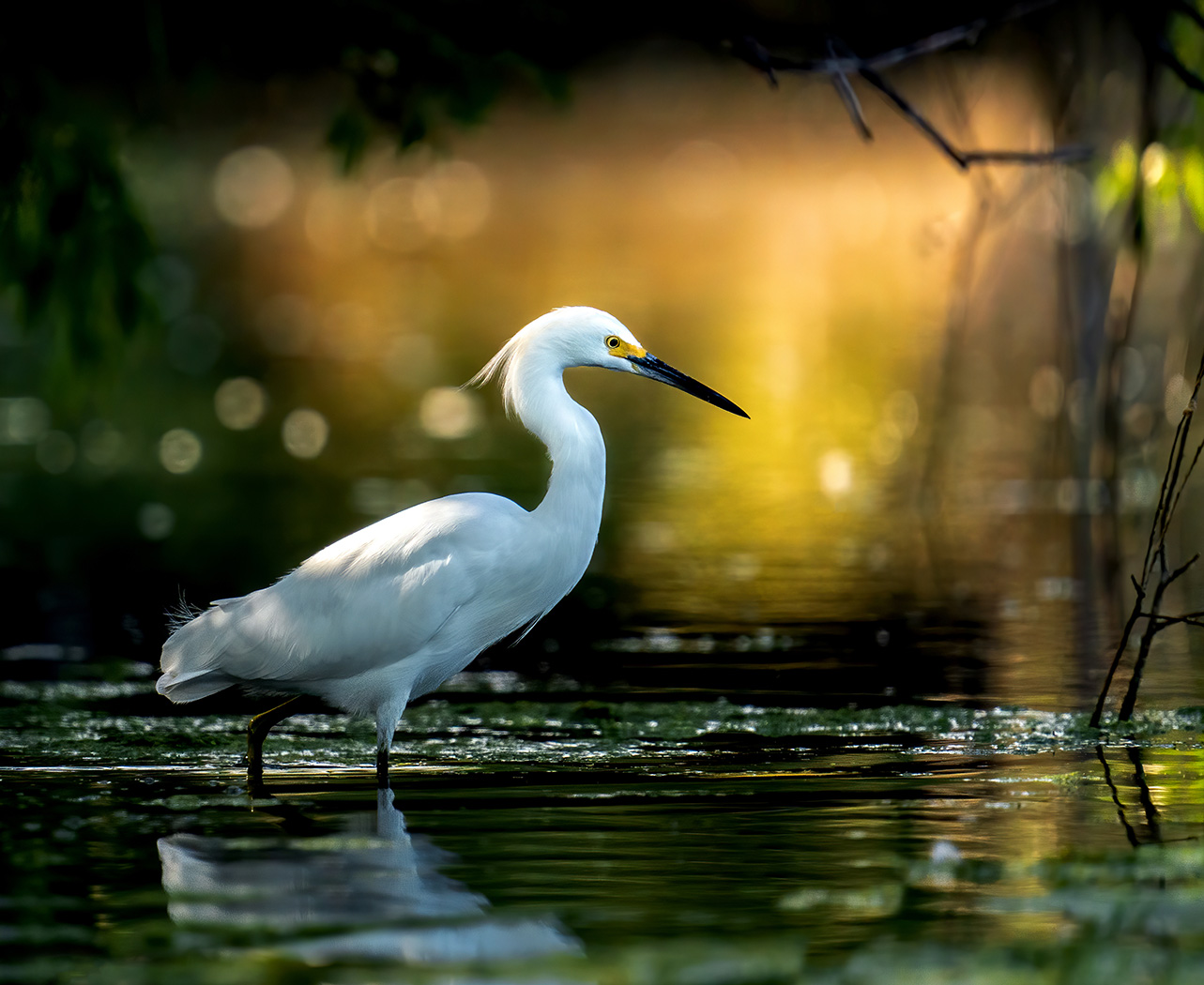 As I peeked under a branch, there was the snowy egret I was looking for, and so nicely backlit by the sun.