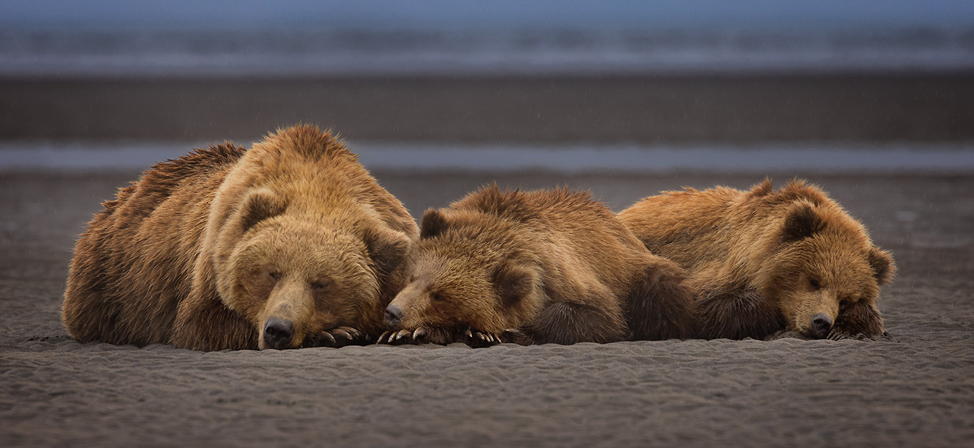 Mom and 2 cub brown bears sleep on the beach in the rain in lake Clark N. park, Alaska. July 2021
