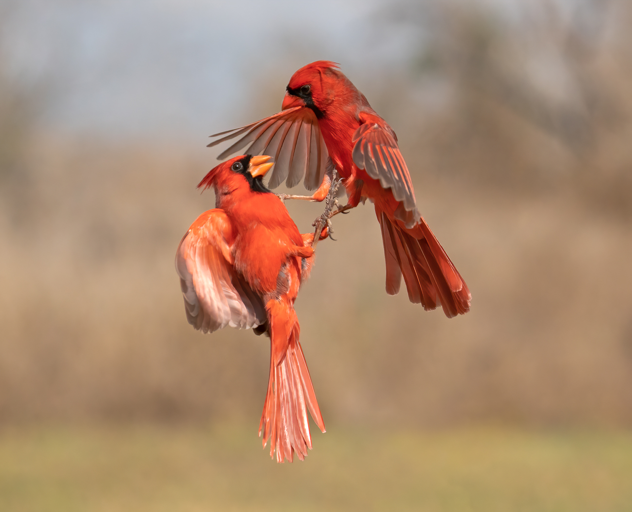 A pair of male cardinals doing battle near a feeder.