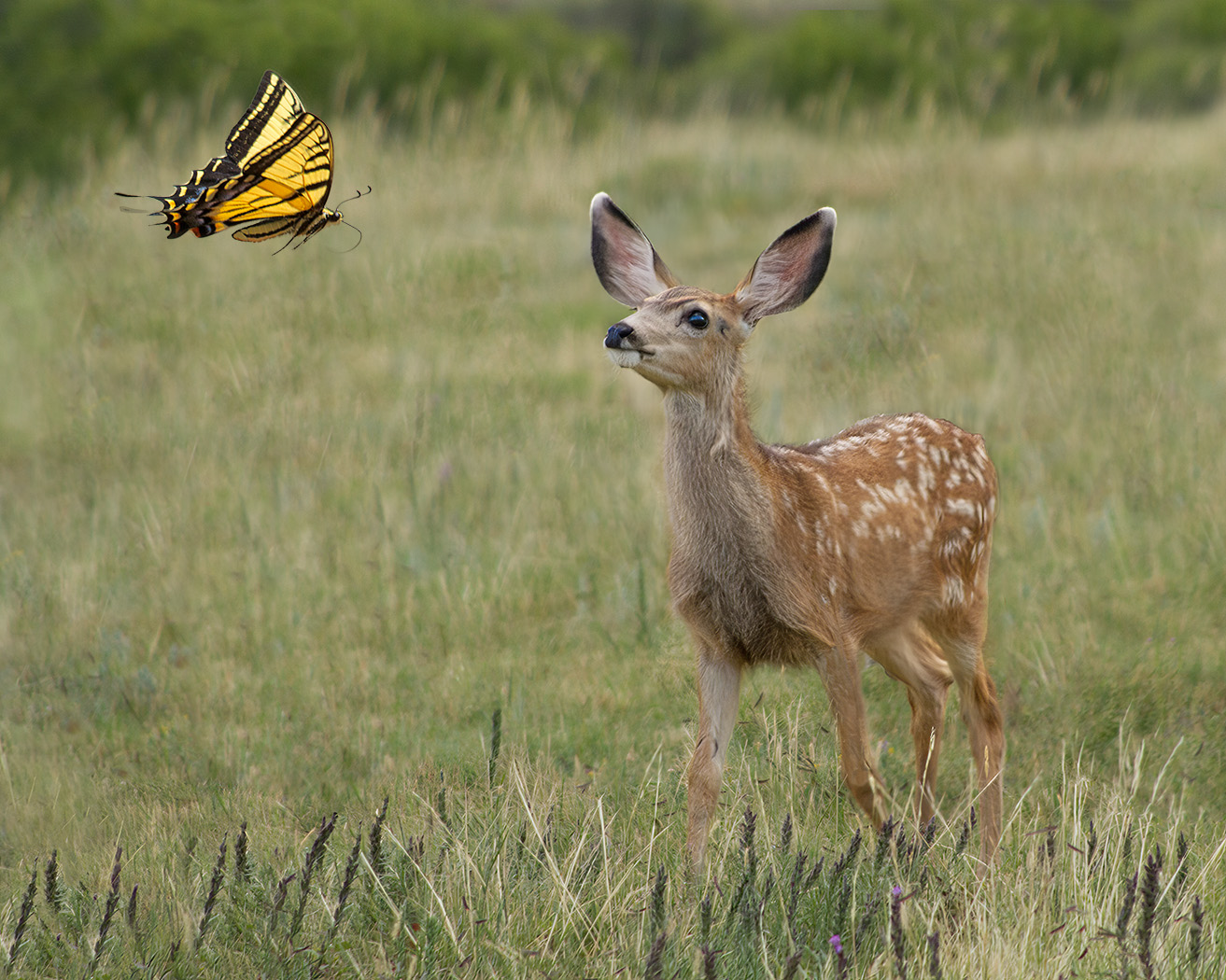 Two different images taken at different times. The mule deer fawn was looking up at the birdbox. I captured the butterfly during a different photo shoot.