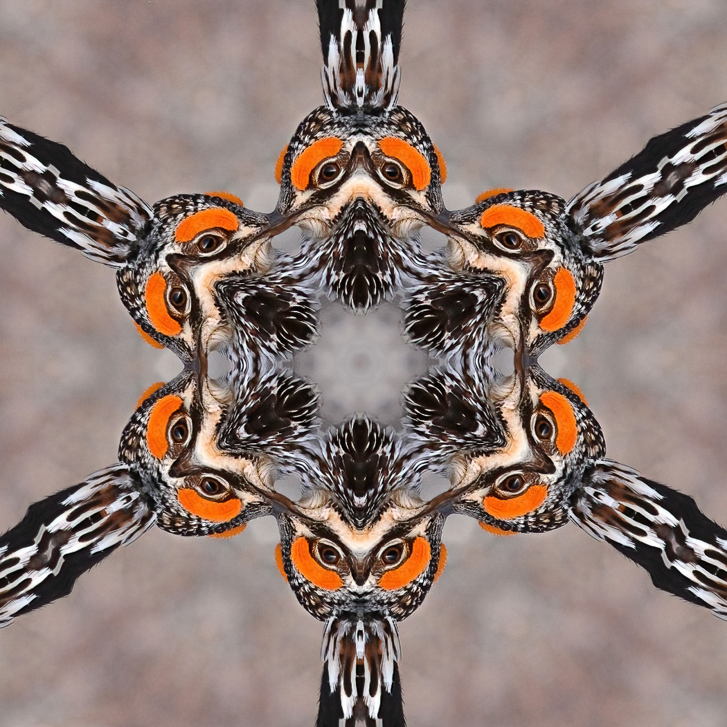 Lesser Prairie Chicken side portrait was layered to form an abstract object which was then duplicated 6 times pivoted and merged in photoshop. End effect looks like an owl but subject is the lesser prairie chicken.