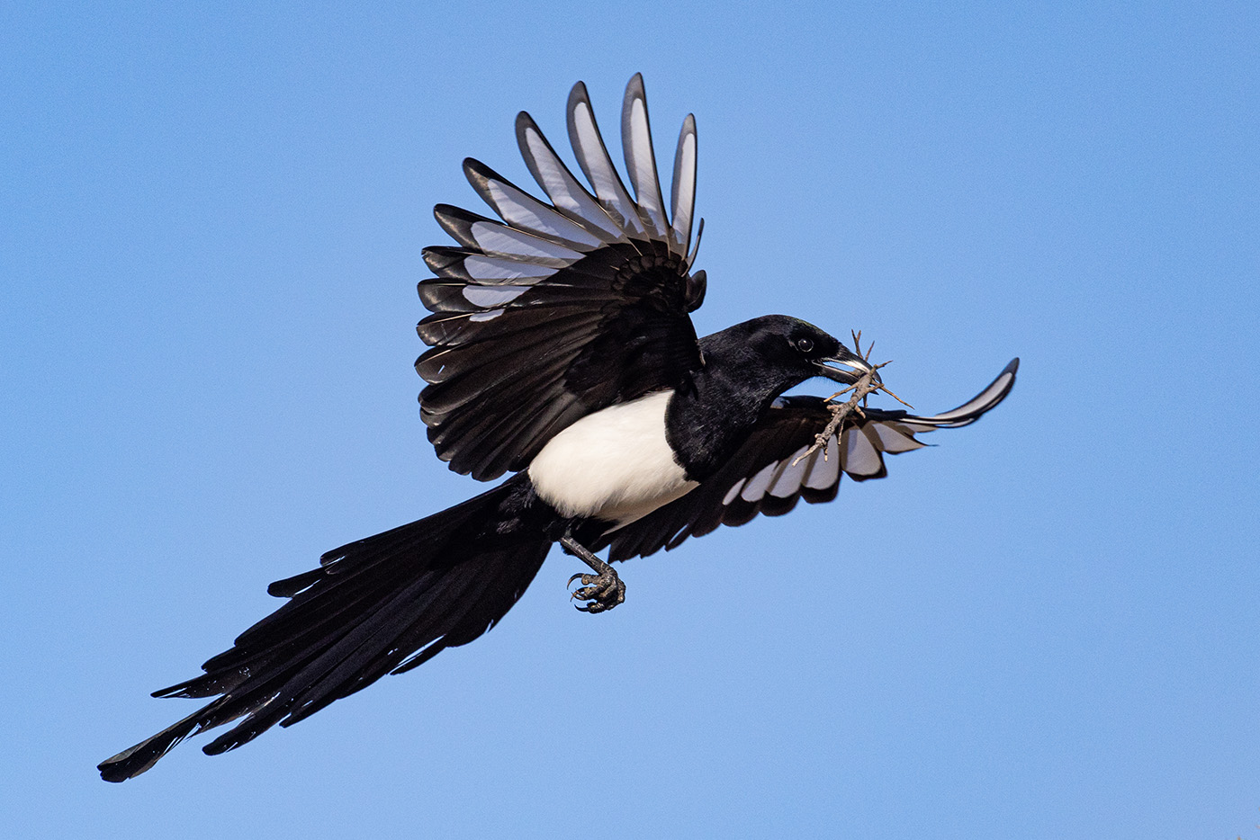The magpies were bringing twigs to the nest fast and furious. It was a busy morning for them.