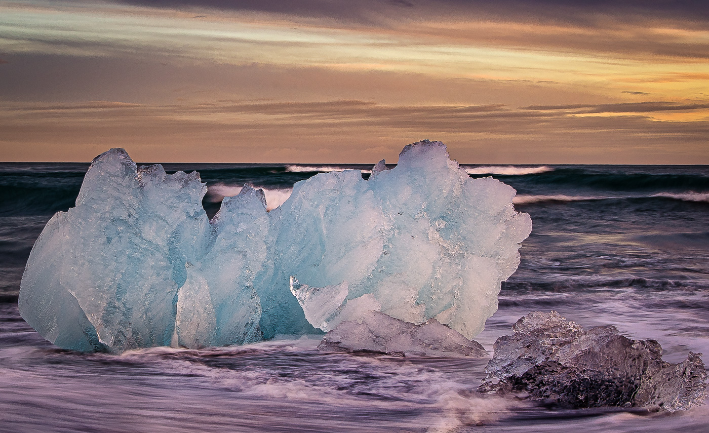 This iceberg, having been discarded by the glacier and carried out to the ocean, has been carved into a work of art by the relentless action of the sand and sea.