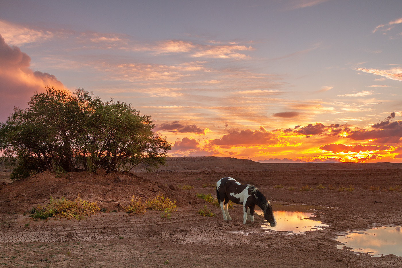 The mustang had been at the watering hole earlier in the evening but when the sunset was fully developed, it had left so I put it back in the image.