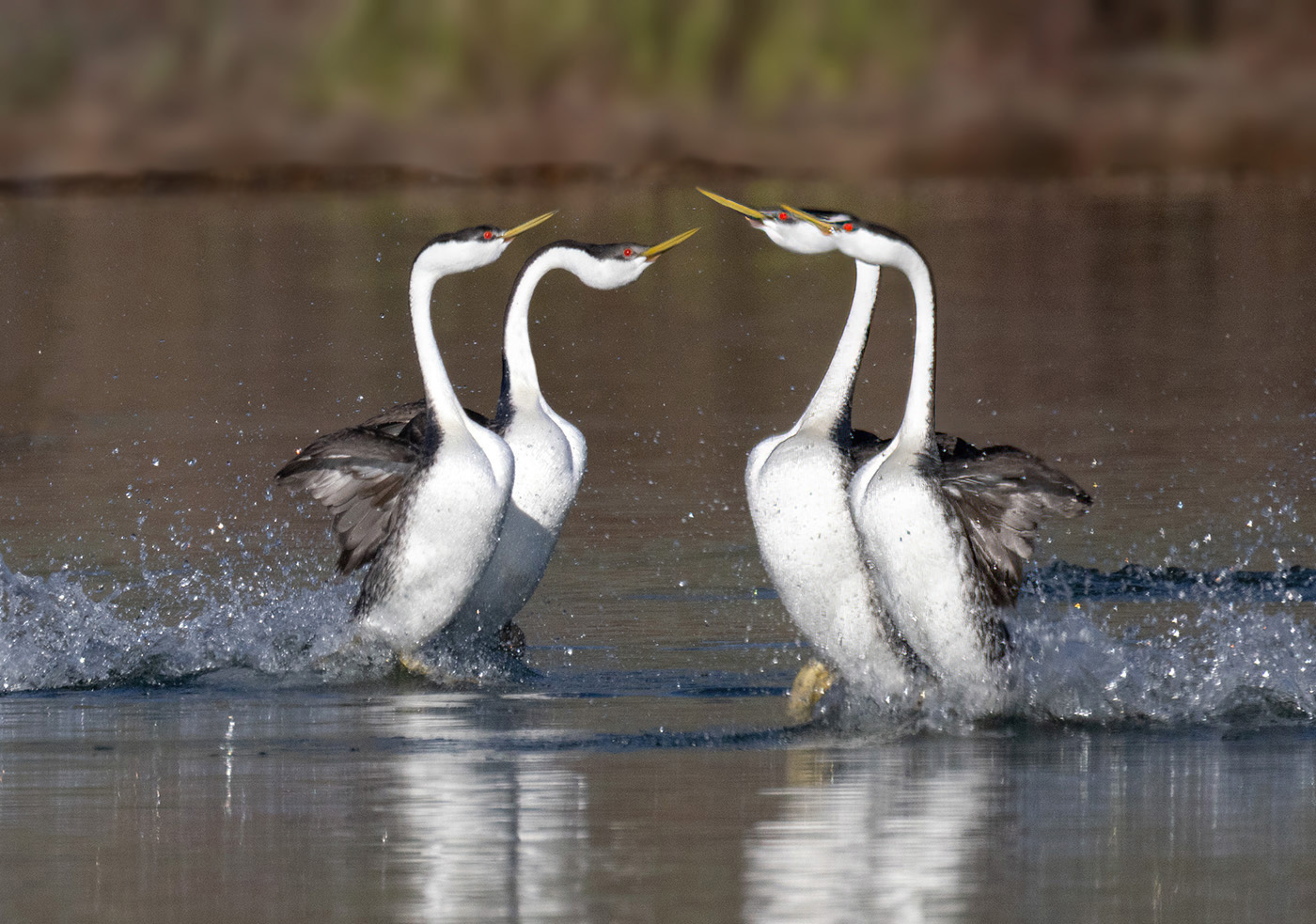 Two pair of Western Grebes pass as they both engage in the Rush Ceremony
