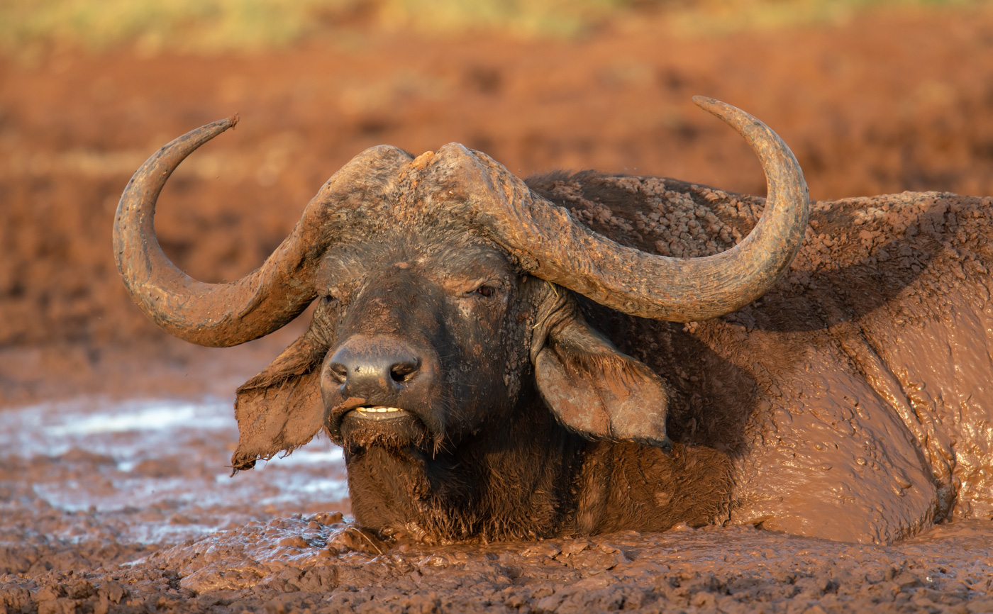 Cape buffalo in the afternoon light having a nice wallow in the mud.