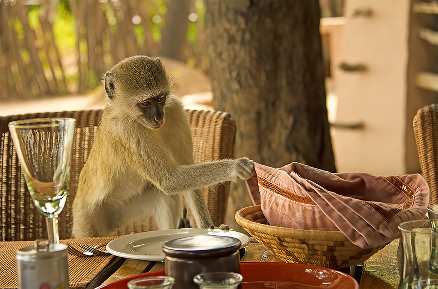 The monkeys would be in the trees and the rafters of this outdoor restaurant at our And Beyond lodge. As soon as someone left their table they would come down for leftovers. This one seemed so polite as it tentatively lifted the cloth over the bread basket. Note to self: always have your camera with you - and be ready.