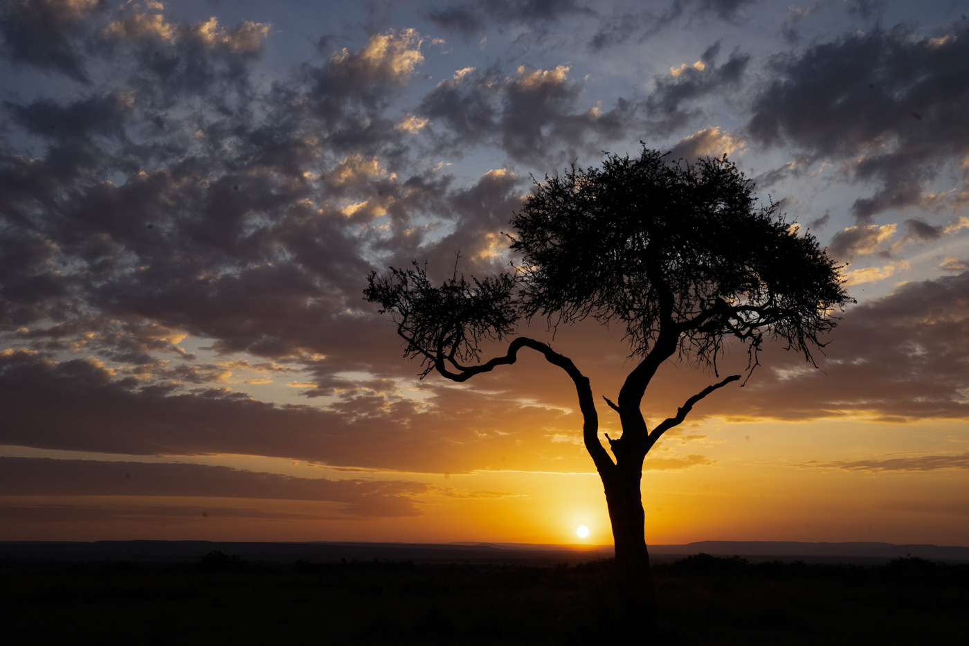 The sun had just risen over the Mara, so it was daylight by then, but when I took the photo I exposed it for the light around the sun, which gave me the silhouette effect and the color gradient in the sky from the gold to the blue.