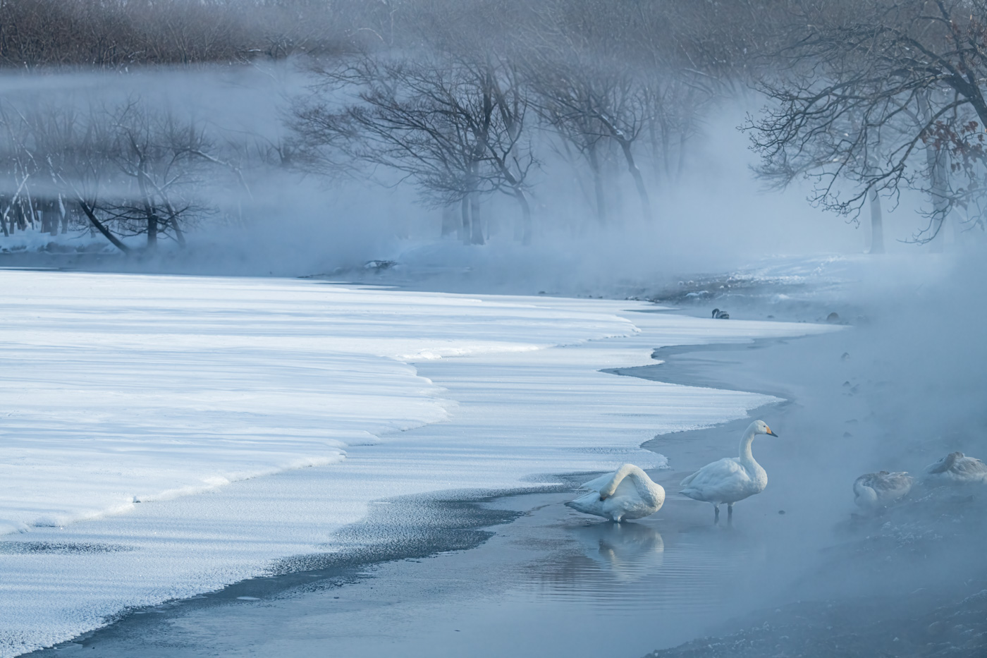 Early morning mist and the Whooper Swans at Lake Kussharo. The swans have a wing span of 7 to 9 feet and weigh up to 30 lbs.