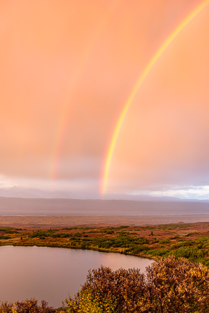 We were out before dawn in Denali National Park. As the sun broke through the clouds, in the distance a double rainbow appeared in the warm, early morning light. Standing on the elevated roadside, I was able to capture in the scene the rainbow with the little pond below where we were looking for moose.