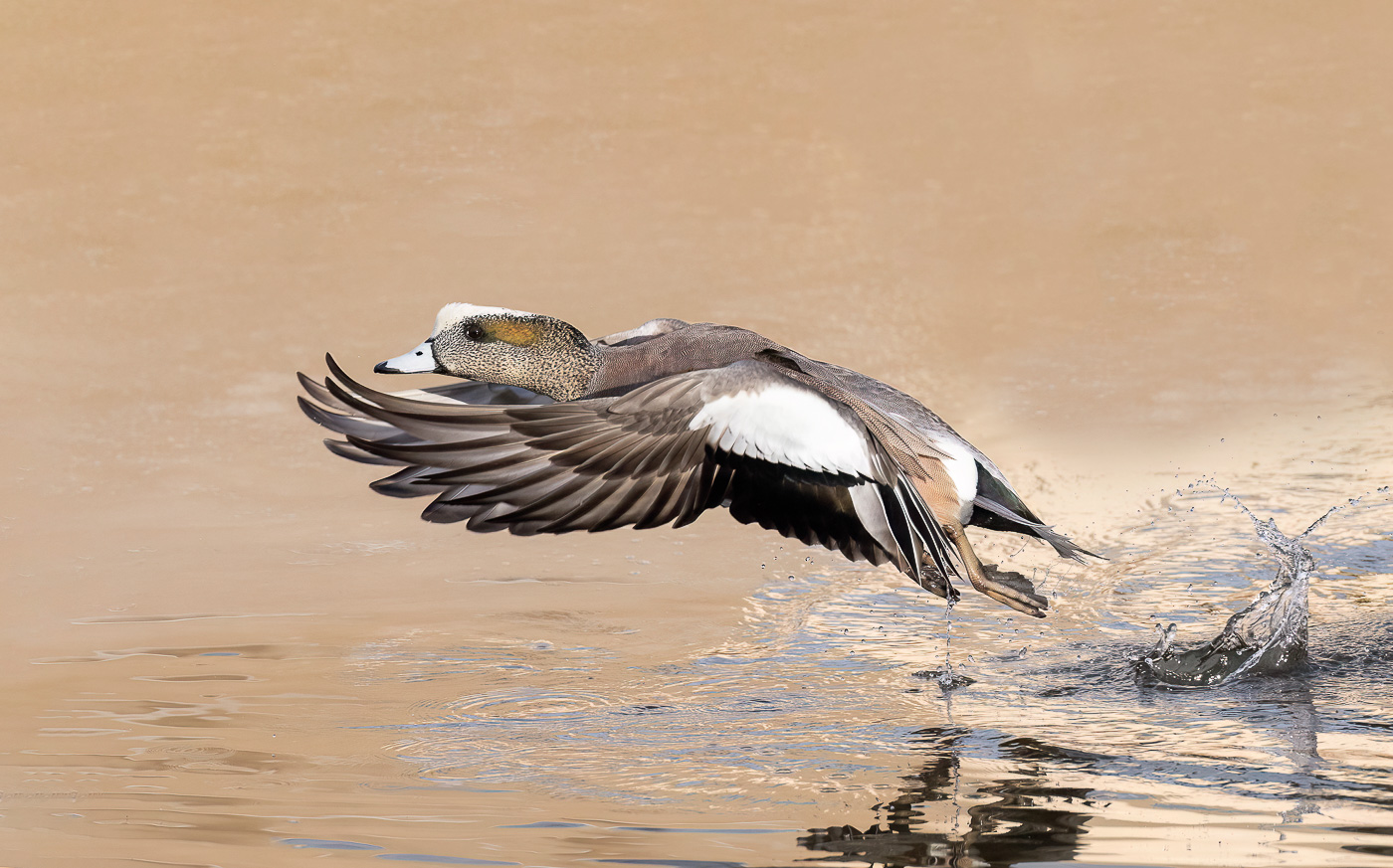 American Wigeon lifting off the river.