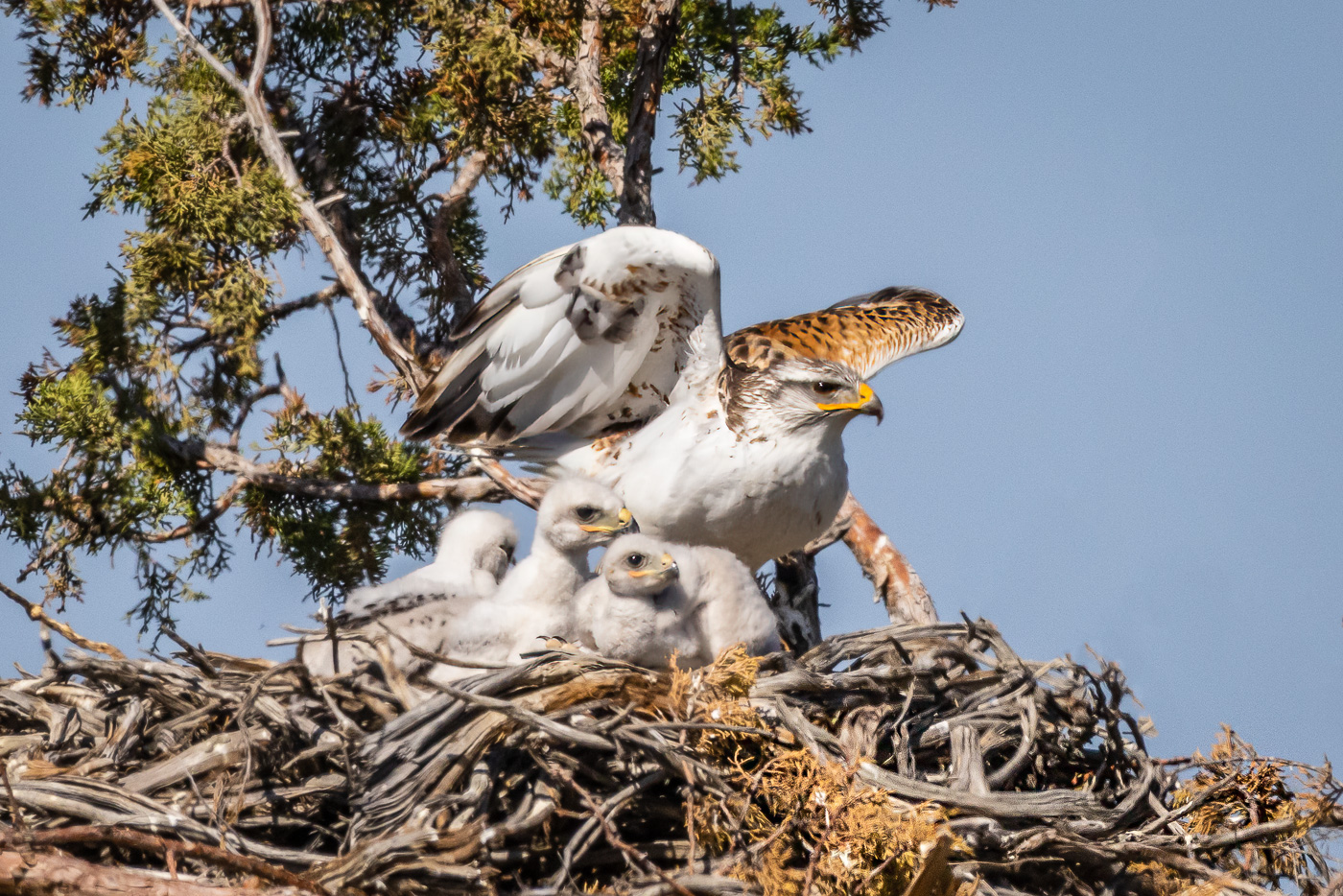 Ferruginous Hawk leaving it's nest to hunt food for its 3 eyas