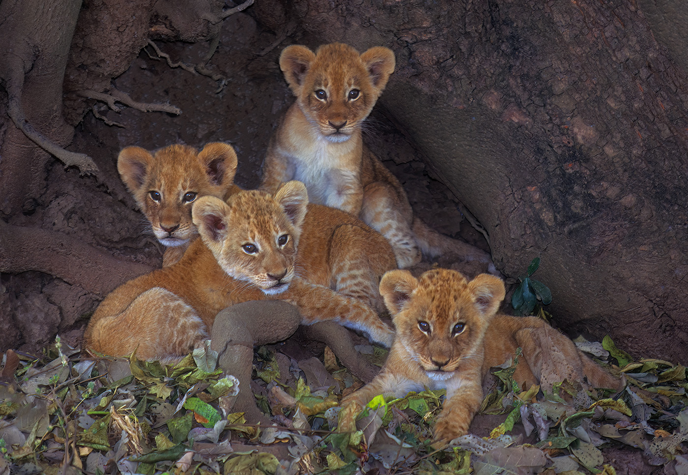 Four Lion cubs wait patiently at the base of a tree while their nurse mother sleeps nearby.