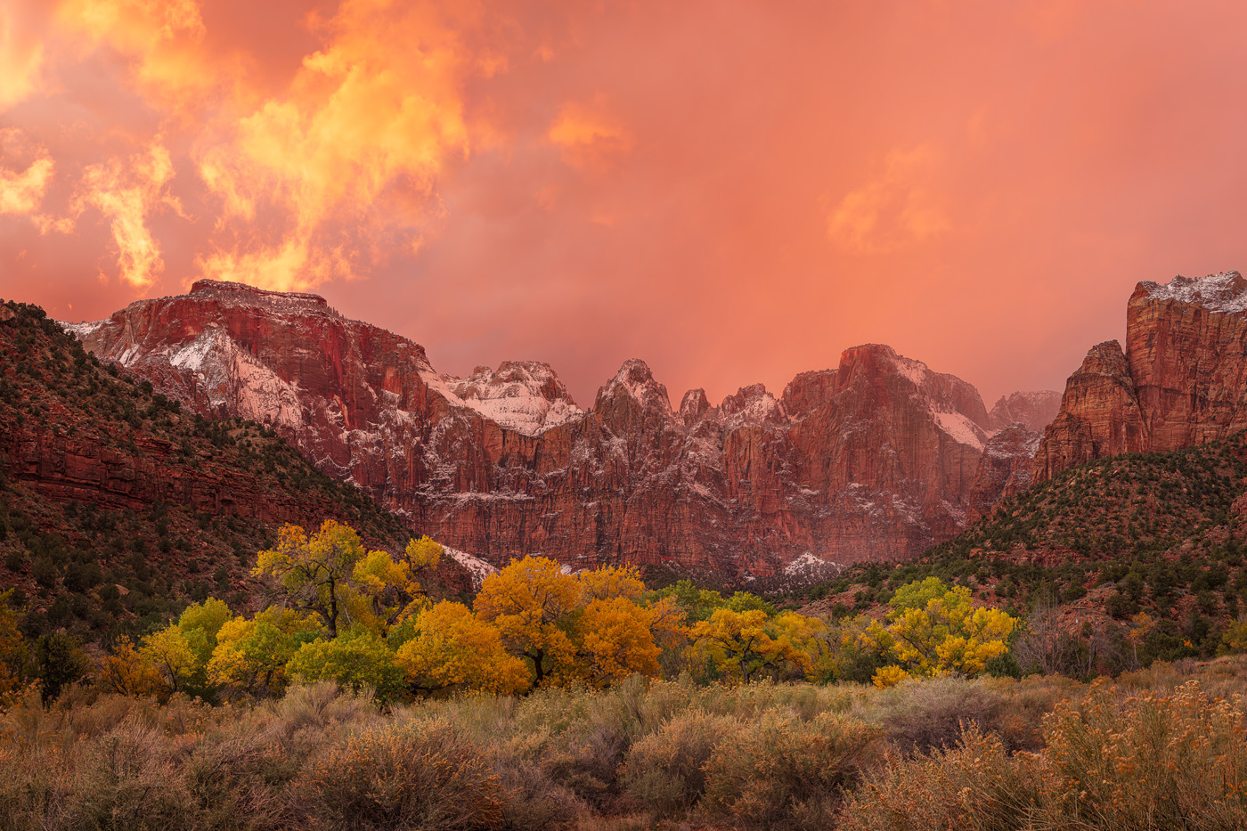 A clearing late autumn storm at sunset resulted in dramatic light at Towers of the Virgin in Zion NP.