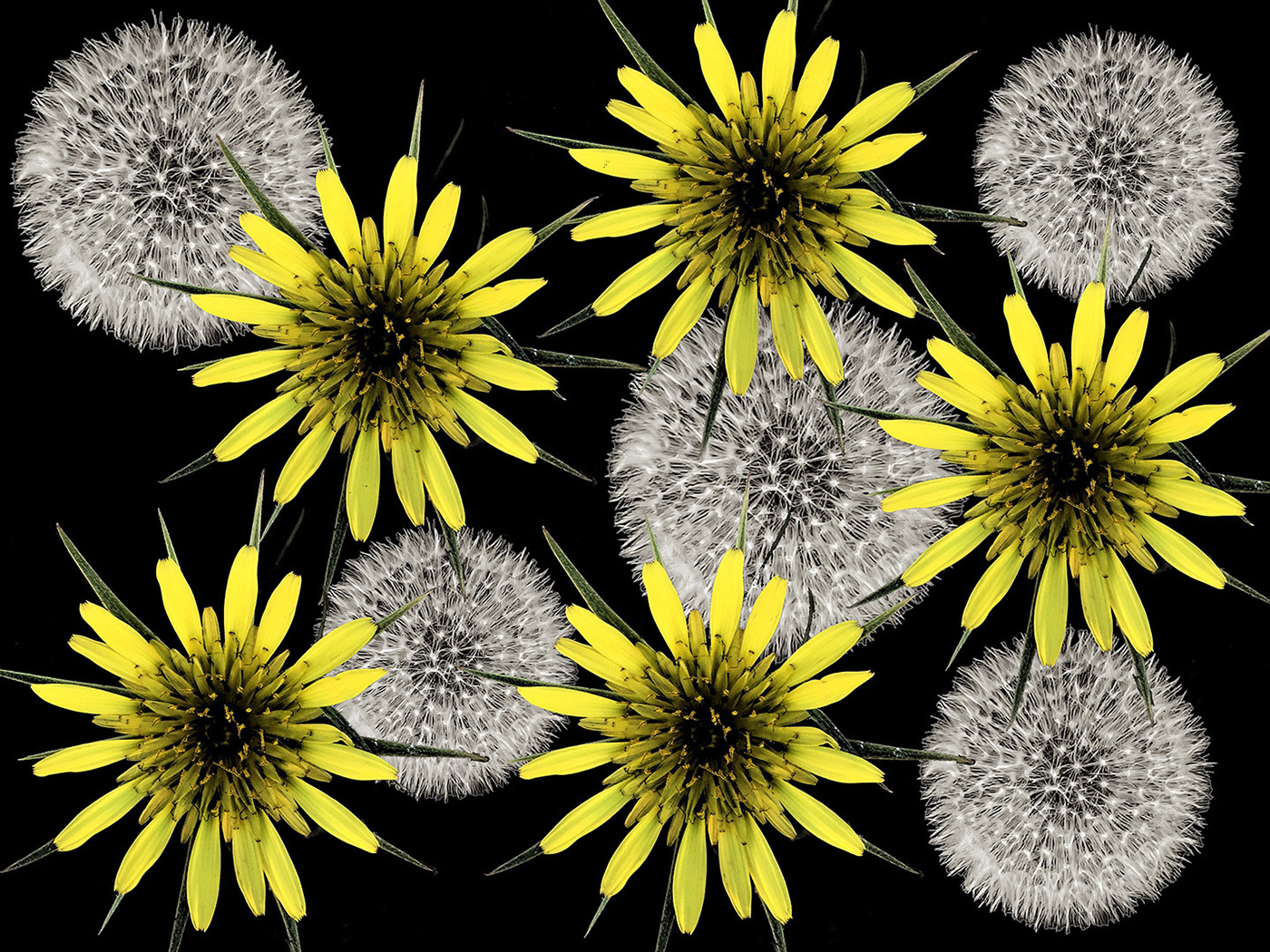 Closeup images of Salsify petals and Dandelion Puffballs were isolated from background. Each image was replicated in 5 layers with some size change for the Puffballs. Positioned each to create the montage.