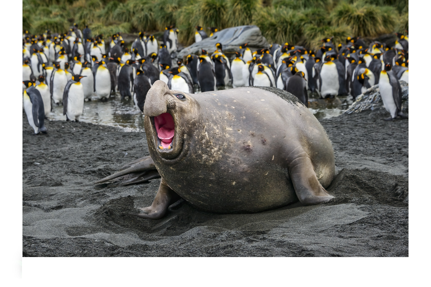 This male Elephant Seal lost the BeachMaster competition and was relegated to hanging out with King Penguins.