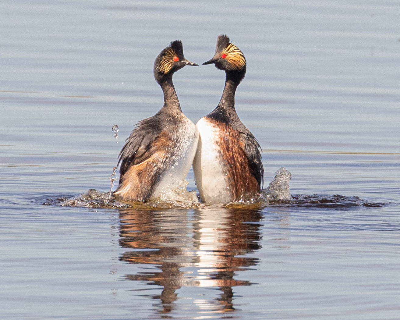 A pair of eared grebes appear to be dancing on the water in their courtship ritual.