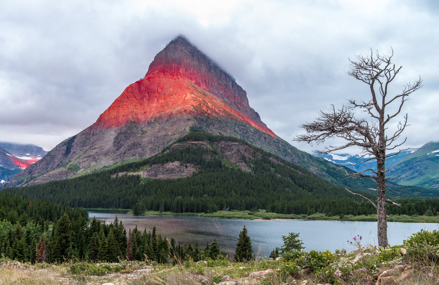 90 seconds of sunrise on Swiftcurrent Mountain from above the Many Glacier Lodge in Glacier National Park. A 4AM wake-up and completely overcast skys did not make us too happy, but the 90 seconds of sunlight sure did. August in Glacier can be unpredictable but if you are lucky and prepared you can make magic happen.