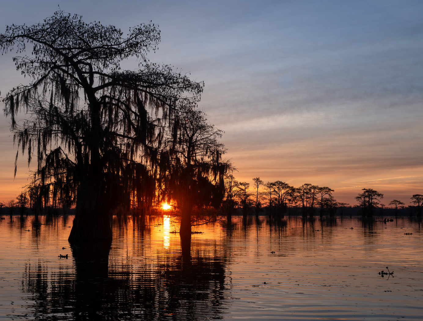 The Atchafalaya Basin is the largest wetland and swamp in the United States. I was lucky to have clear skies that morning with the orange sun shining through the trees.