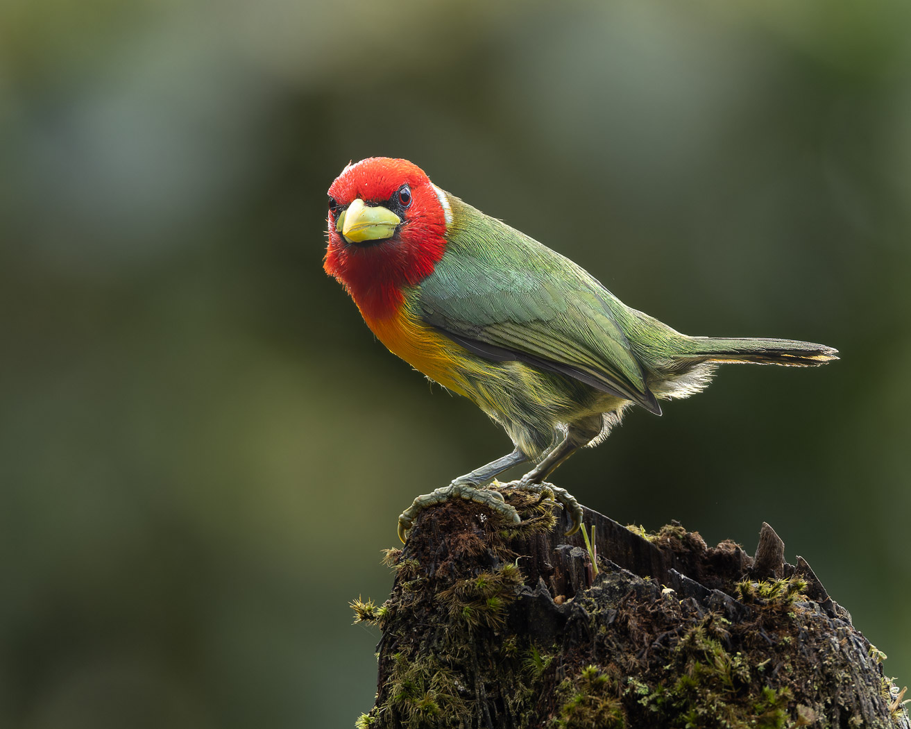 A Red-headed Barbet stares down the photographer in the Columbian rain forest