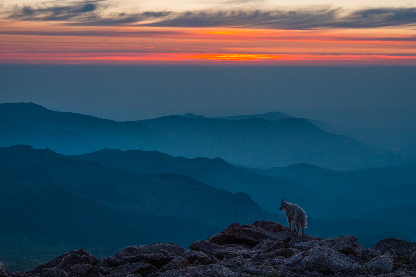 A mountain goat admiring the view shortly before sunrise at the top of Mount Blue Sky.