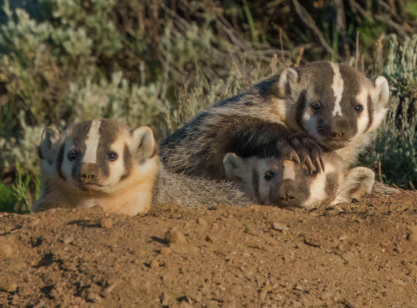 Three Badgers atop their sett or burrow.